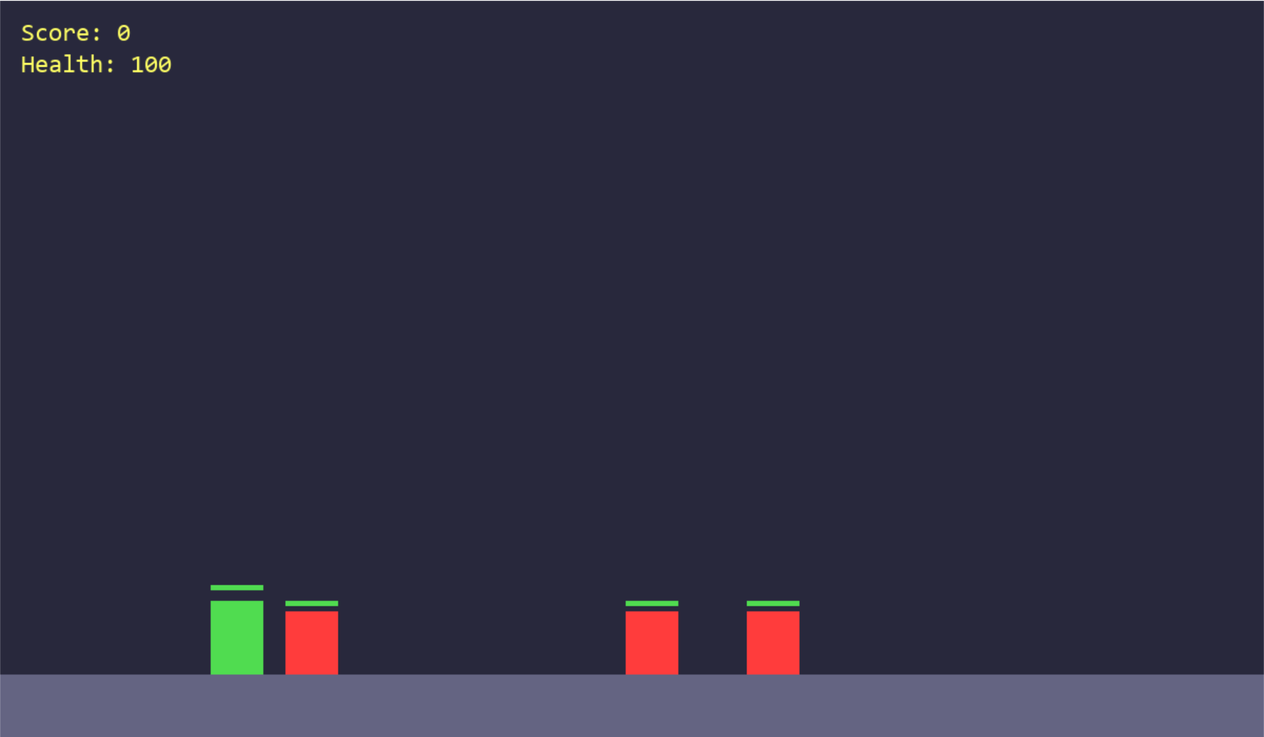 Move your green character using A and D. Press SPACE to jump and avoid obstacles. Press J to shoot yellow bullets at the red enemies. Watch out for the rare blue bosses—they are much stronger! Each enemy you defeat gives you points, shown in the top-left corner. Keep an eye on your health bar—if it reaches zero, the game is over. Try to survive as long as you can, earn lots of points, and defeat the bosses!